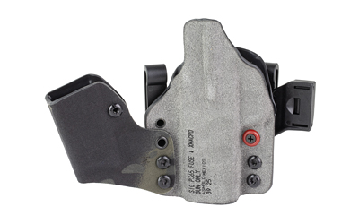 An ergonomic, mission-adjustable, RDS-compatible, multi-positional, deep concealment IWB hybrid thermoplastic holster. Its distinctive features enable concealed carry for a wide range of handgun fits from various carry positions while allowing a full firing grip prior to drawing. The design includes passive retention and adjustable tension, enabling a finely tuned fit and smooth draw. This evolution of the IncogX features a series of clips that provide more adaptability to the user while maintaining the original goals of improved grip, concealment, and function. The clips open outward and slide down with the holster, naturally locking over the belt. An actuated finger tab flexes to open, allowing quick installation or removal from the belt. An improved clip strut design combines functionality with customized concealment shims that can be easily installed or removed without tools. All IncogX models come with clip strut shims in three different concealment sizes: 1/8″, 1/4″, and 3/8″.