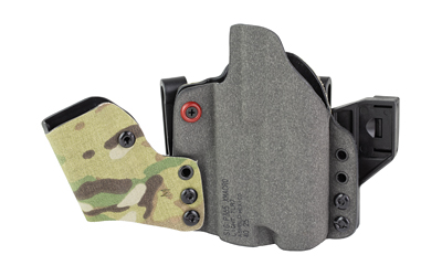 An ergonomic, mission-adjustable, RDS-compatible, multi-positional, deep concealment IWB hybrid thermoplastic holster. Its distinctive features enable concealed carry for a wide range of handgun fits from various carry positions while allowing a full firing grip prior to drawing. The design includes passive retention and adjustable tension, enabling a finely tuned fit and smooth draw. This evolution of the IncogX features a series of clips that provide more adaptability to the user while maintaining the original goals of improved grip, concealment, and function. The clips open outward and slide down with the holster, naturally locking over the belt. An actuated finger tab flexes to open, allowing quick installation or removal from the belt. An improved clip strut design combines functionality with customized concealment shims that can be easily installed or removed without tools. All IncogX models come with clip strut shims in three different concealment sizes: 1/8″, 1/4″, and 3/8″.